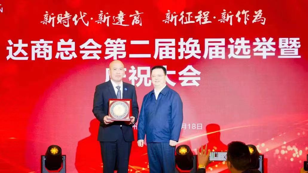 达州市人大常委会主任邓瑜华为达商总会第二届会长刘江东颁发牌匾,勉励其为全体达商的共同进步、为家乡建设发展砥砺前行。
