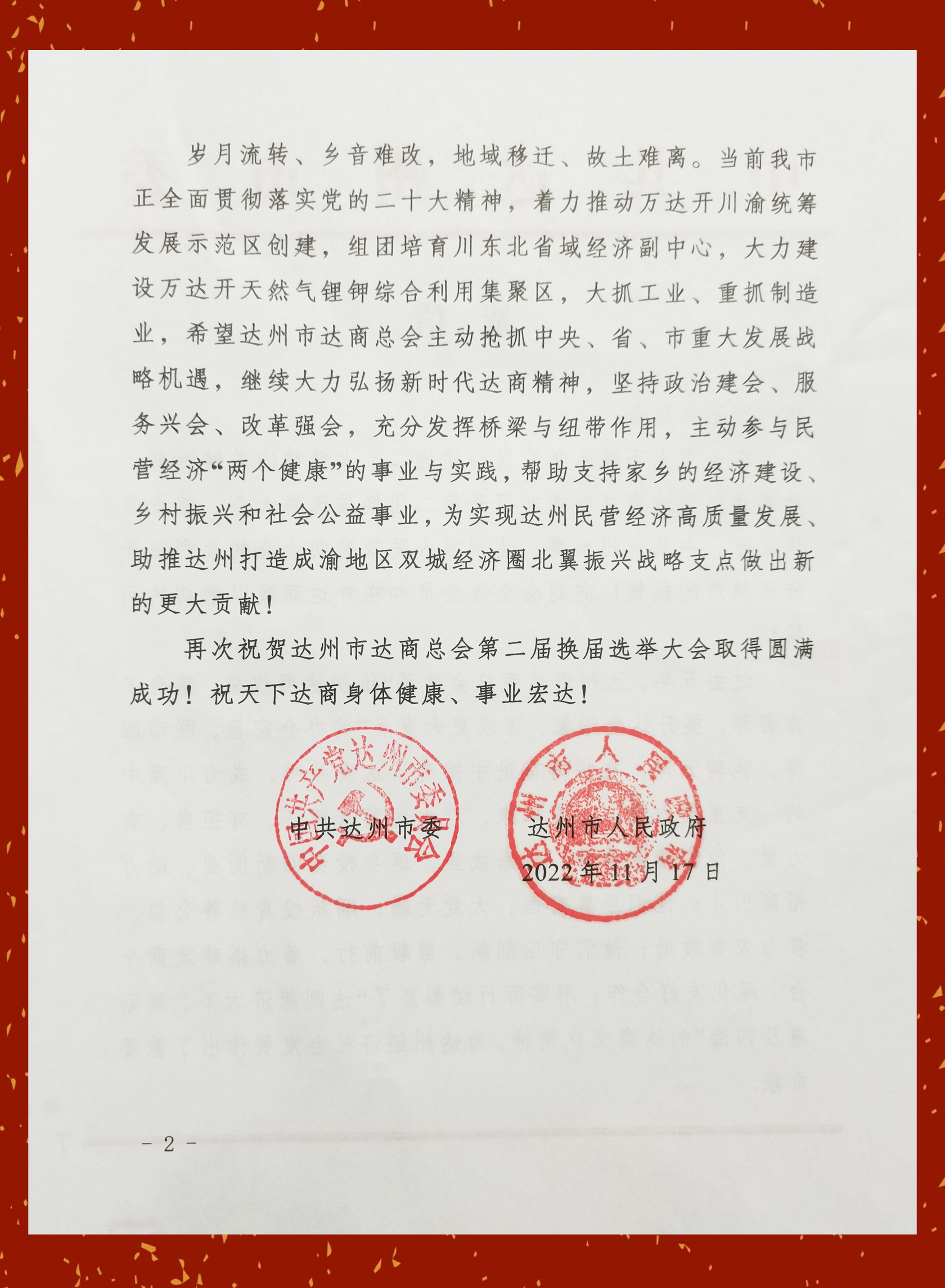 达州市委常委、统战部部长、市总工会主席王蔚荩向大会宣读了达州市委市政府贺信:过去五年,达州市达商总会秉承“维护达商权益,整合多方资源,提升达商形象,谋求更大发展”的办会宗旨,联动四海、驰骋五洋,在拼搏奋进中擦亮了达商品牌,成为川商中的一支重要力量。一直以来,广大达商有情怀、有担当、有力量,他们情系桑梓、心系故里,返乡投资创新创业、助力招商引才;他们乐善有恒、大爱无疆,踊跃投身慈善公益、参与灾害救助;他们守正创新、勇毅前行,着力搭建政商平台、深化友好合作,用实际行动彰显了“达则兼济天下、商则惠及四海”的达商文化精神,为达州经济社会发展作出了重要贡献。岁月流转、乡音难改,地城移迁、故土难离。希望达州市达商总会主动抢抓中央、省、市重大发展战略机遇,继续大力弘扬新时代达商精神,坚持政治建会、服务兴会、改革强会,充分发挥桥梁与纽带作用,主动参与民营经济“两个健康”的事业与实践,帮助支持家乡的经济建设、乡村振兴和社会公益事业,为实现达州民营经济高质量发展、助推达州打造成渝地区双城经济圈北翼振兴战略支点做出新的更大贡献!