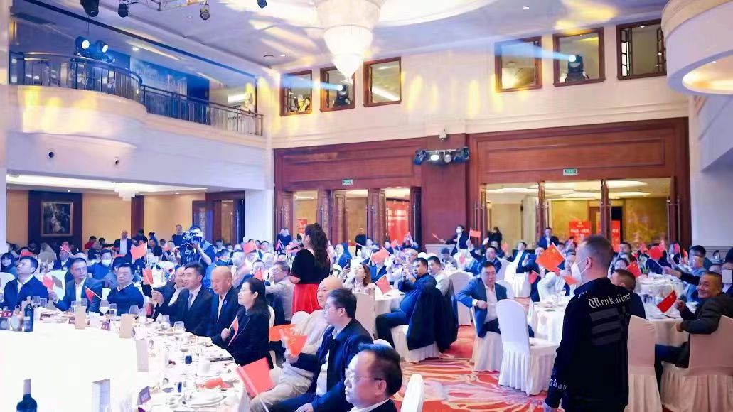 最后,达商总会终身名誉会长刘峙宏、会长刘江东、执行会长郑权国上台,共同为晚宴致祝酒词:让我们一起,为祖国的繁荣昌盛,为家乡的蓬勃发展,为达商的蒸蒸日上,为自己和家人的平安幸福,干杯!